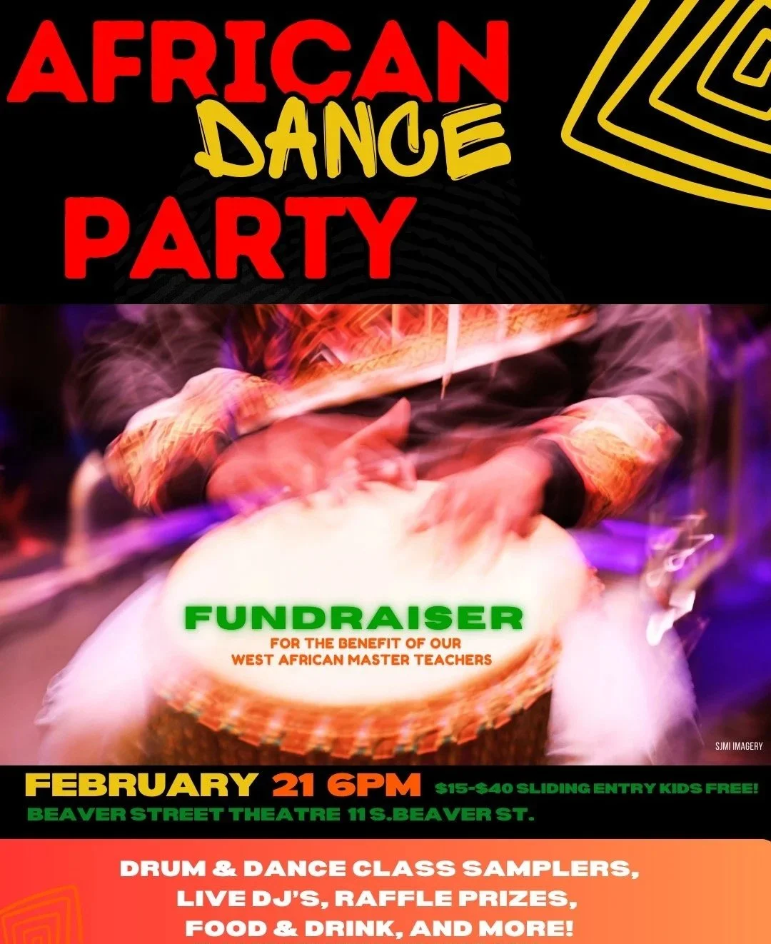 We begin with a warm-up followed by a brief description of the cultural context of the rhythm/dance. The moves are then broken down and danced to live drums!